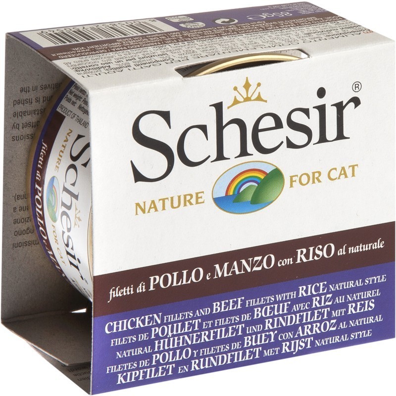 کنسرو فیله مرغ با بیف و برنج شسیر Schesir از بهترین مواد اولیه 100 درصد طبیعی تهیه شده است و درتهیه آن هیچ گونه رنگ و مواد افزودنی و هورمون استفاده نشده است. این کنسرو با طعم خاص خود تجربهای جدید و خوشمزه را برای گربه شما به ارمغان میآورد. این کنسرو دارای تکههای فیله مرغ، بیف و برنج بخارپز شده است که با روشهایی مشابه روشهای تهیه کنسروهای انسانی تهیه شده است. مصرف این غذا باعث اختلال در دستگاه گوارش نشده و میتوانید با خیال راحت آن را در رژیم غذایی گربه خود قرار دهید.