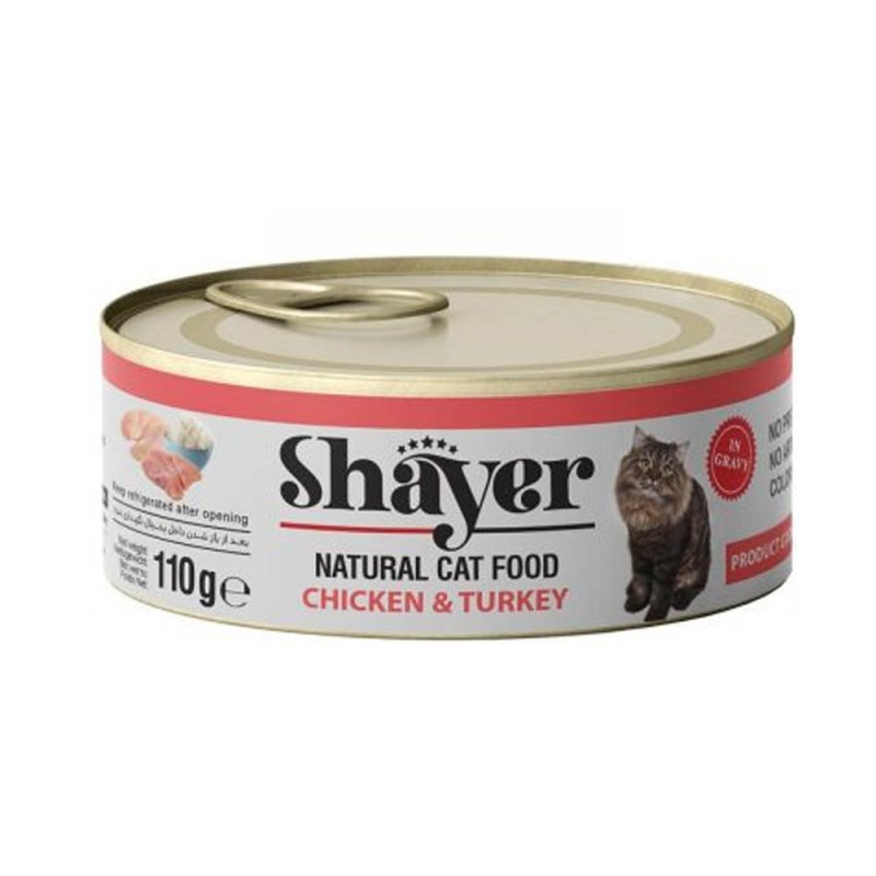 این محصول ۱۰۰ درصد طبیعی و تشکیل شده از فـیلـه مـرغ، بوقلمون، برنج و آب گوشـت می باشد. این کنسرو یک وعده غذایی کامل، دلچسب و مقوی برای گربه دلبند شماست. گوشت مرغ و بوقلمون به سبب دارا بودن مواد معدنی، ویتامینها و مقدار فراوان آنتی اکسیدان سلنیوم برای بهبود عملکرد غده تیروئید، تقویت سیستم ایمنی بدن حیوان و افزایش متابولیسم سلولی بدن او لازم و در واقع ضروری می باشد. این کنسرو حاوی مقادیر بالای پروتئین می باشد که سبب شده تا این محصول مناسب برای گربه ها در تمامی سنین باشد. کنسرو مرغ و بوقلمون شایر عاری از هرگونه مواد شیمیایی، افزودنی ها، رنگ های مصنوعی و فیلرها می باشد، که این امر باعث سلامت هر چه بیشتر این محصول برای حیوان شما گشته است.